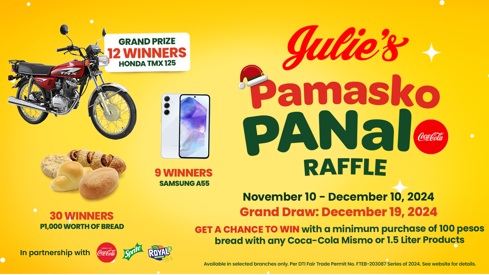 Maagang pamasko ang naghihintay sainyo sa Julie’s Pamasko Panalo Raffle Promo! 12 winners ang maaaring mag uwi ng brand new Toyota TMX 125, 9 winners ng Samsung A55 at 30 winners ng 1,000 pesos worth of Julie’s bread na perfect pang Noche Buena!