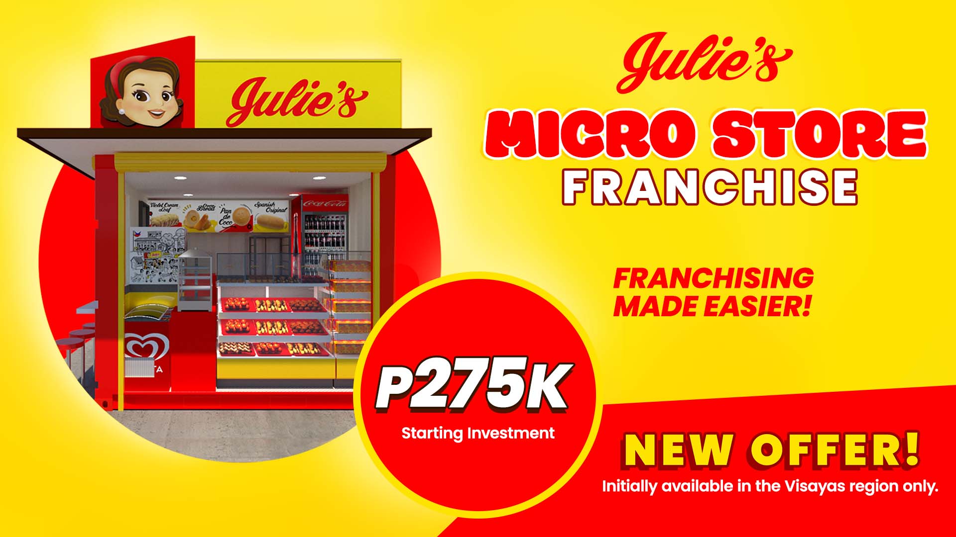 Franchising made easier — Julie’s Bakeshop launches its newest franchise program with an initial investment of P275,000 only! In celebration of its 40th year, aspiring Micropreneurs can avail of the lowest franchise offer yet. The Julie’s Micro Store franchise is initially available in the Visayas region only. Keep an eye on our official social media pages for updates!